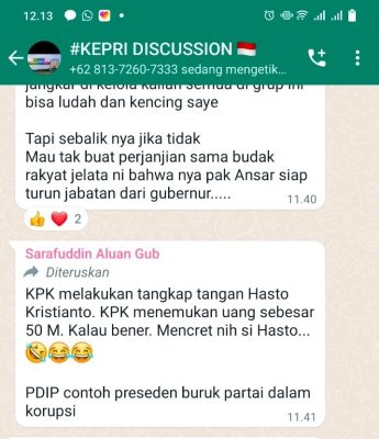 Tanjungpinang, (digitalnews) – Diduga Tim Khusus (Timsus) Sarafuddin Aluan lakukan pelecehan terhadap Sekjend PDI Perjuangan Hasto Kristiyanto di media sosial WhatsApp, Kamis (29/09/2022).