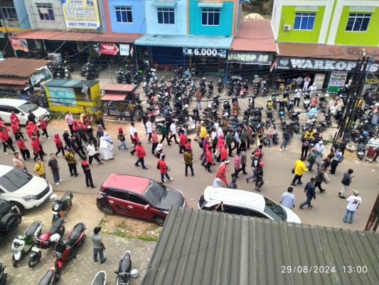 Lis-Raja berjalan kaki saat ingin mendaftar ke KPU, dan ditunggu oleh ratusan pendukungnya di kantor pelaksana pemilihan kepala daerah (KPU.red) di Jalan Handjoyo Putro, Km 8 atas.