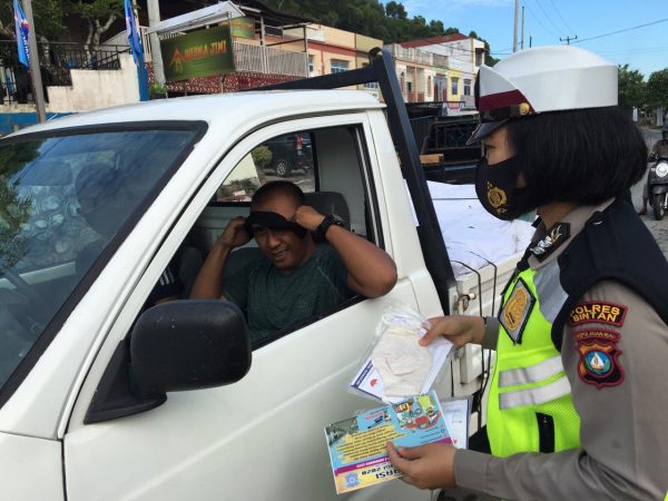 “Kita juga melaksanakan teguran kepada pengguna jalan yang tidak menggunakan helm, membagikan masker kain kepada pengguna jalan yang tidak menggunakan makser, membagikan stiker dan brosur tentang imbauan tertib berlalu lintas dan Prokes Covid-19,” ujarnya.