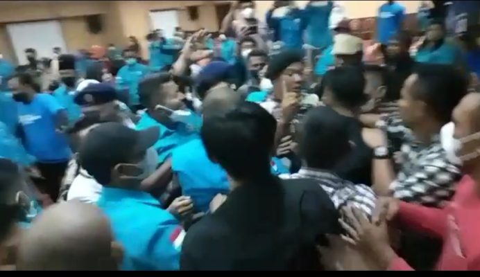 Bentrokan di lokasi acara pun tak terelakkan. Beberapa petugas dari pihak kepolisian sibuk menghadang bentrokan tersebut yang nyaris terjadinya baku hantam antar kedua kubu.