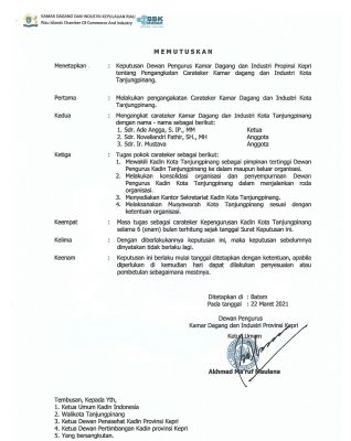 Surat tersebut memutuskan Ade Angga S.IP.,MM menjabat sebagai Carateker Ketua Kadin Kota Tanjungpinang, anggota Novaliandri Fathir dan Ir. Mustava.