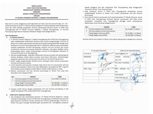 Sebelumnya diberitakan, Beredar berita acara dan studi banding pengelolaan terminal penumpang bersama Komisi III DPRD Kota Tanjungpinang dengan PT Pelindo (Persero) Tanjungpinang terkait kenaikkan tarif pas Pelabuhan Sri Bintan Pura (SBP).