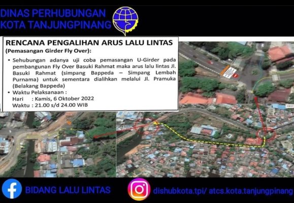 Tanjungpinang, (digitalnews) – Dalam rangka uji coba pemasangan U-Grider Fly Over di Simpang Jalan Basuki Rahmat, Dinas Perhubungan (Dishub) Kota Tanjungpinang melaksanakan buka tutup di jalan sekitar pembangunan Fly Over.