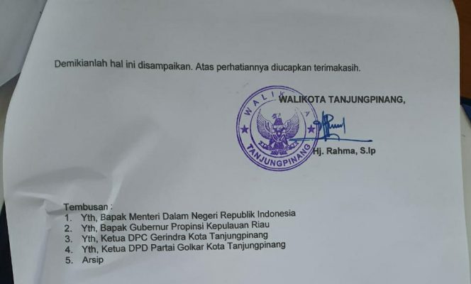 Surat yang beredar tersebut ditandatangani langsung oleh Wako Rahma ditembuskan ke Kemendagri, Gunernur Provinsi Kepri, DPD Partai Gerindra , DPRD DPD Partai Golkar dan Arsip.
