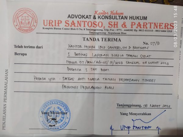 Ketua RT 002 Jazuri bersama warga atas petunjuk Anggota DPRD Provinsi Kepri Lis Darmansyah, mempercayakan laporan tersebut ke Penasehat Hukum (PH) Urip Santoso SH.